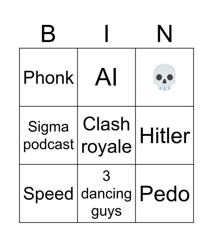 This bingo card has a free space and 8 words: Hitler, 💀, AI, Speed, Phonk, Pedo, Sigma podcast and 3 dancing guys.
