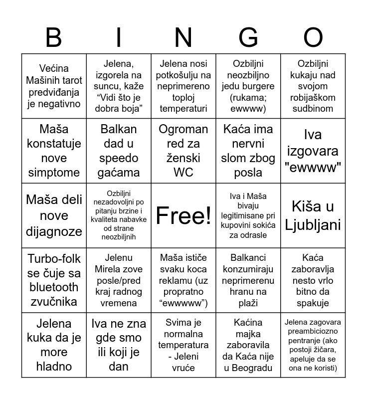 This bingo card has a free space and 36 words: Iva komunicira sa Ex-YU narodima na engleskom, Jelena ima valunge, Jelena poslednja ulazi u more, Balkan dad u speedo gaćama, Balkanci konzumiraju neprimerenu hranu na plaži, Turbo-folk se čuje sa bluetooth zvučnika, Ogroman red za ženski WC, Italijani ne razumeju engleski, Ozbiljni kukaju nad svojom robijaškom sudbinom, Ozbiljni osuđuju izbor pića neozbiljnih, Ozbiljni nezadovoljni po pitanju brzine i kvaliteta nabavke od strane neozbiljnih, Ozbiljni neozbiljno jedu burgere (rukama; ewwww), Ozbiljni dovode u pitanje sposobnost orijentacije neozbiljnih, Iva i Maša bivaju legitimisane pri kupovini sokića za odrasle, Iva izgovara "ewwww", Većina Mašinih tarot predviđanja je negativno, Iva pogrešno identifikuje nešto (primer: zmaaaaaj), Jelenu Mirela zove posle/pred kraj radnog vremena, Jelena zagovara preambiciozno pentranje (ako postoji žičara, apeluje da se ona ne koristi), Jelena nosi potkošulju na neprimereno toploj temperaturi, Kiša u Ljubljani, Kaća zaboravlja nesto vrlo bitno da spakuje, Iva ne zna gde smo ili koji je dan, Jelena kuka da je more hladno, Svima je normalna temperatura - Jeleni vruće, Jelena, izgorela na suncu, kaže “Vidi što je dobra boja”, Maša deli nove dijagnoze, Mašina i Ivina nabavka se oduži zbog čitanja natpisa na slovenačkom, Kaća ima nervni slom zbog posla, Maša konstatuje nove simptome, Olivera zove da proveri jesmo žive, pa nastavlja priču svojim dogodovštinama, Jelena sat vremena priča sa Nenadom, sve vreme koluta očima, Kaćina majka zaboravila da Kaća nije u Beogradu, Maša ističe svaku koca reklamu (uz propratno “ewwwww”), Jelena se nervira jer neko ne zna šta je u planu puta and Jelena predlaže izlet u prirodu umesto u Zagreb u povratku.