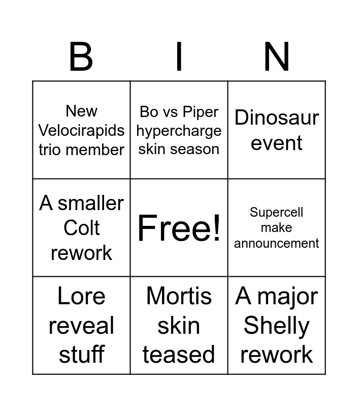 This bingo card has a free space and 8 words: Supercell make announcement, Dinosaur event, Bo vs Piper hypercharge skin season, Lore reveal stuff, New Velocirapids trio member, A major Shelly rework, A smaller Colt rework and Mortis skin teased.