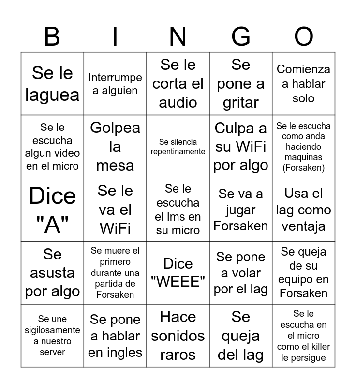 This bingo card has a free space and 24 words: Se muere el primero durante una partida de Forsaken, Se pone a hablar en ingles, Se silencia repentinamente, Se une sigilosamente a nuestro server, Comienza a hablar solo, Se le laguea, Se le escucha algun video en el micro, Interrumpe a alguien, Se va a jugar Forsaken, Dice "WEEE", Culpa a su WiFi por algo, Dice "A", Se pone a volar por el lag, Se queja de su equipo en Forsaken, Golpea la mesa, Se queja del lag, Usa el lag como ventaja, Se le corta el audio, Se le escucha como anda haciendo maquinas (Forsaken), Se le va el WiFi, Se le escucha en el micro como el killer le persigue, Se asusta por algo, Se pone a gritar and Hace sonidos raros.