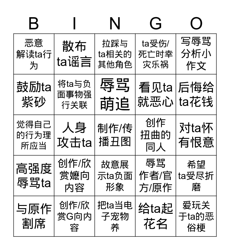 This bingo card has 25 words: 高强度辱骂ta, 创作/欣赏G向内容, 制作/传播丑图, 给ta起花名, 写辱骂分析小作文, 恶意 解读ta行为, 散布 ta谣言, 拉踩与 ta相关的其他角色, 创作 扭曲的同人, 希望 ta受尽折磨, 鼓励ta紫砂, 将ta与负面事物强行关联, 把ta当电子宠物养, 辱骂 作者/官方/原作, 后悔给ta花钱, 与原作割席, 人身 攻击ta, 辱骂萌追, 看见ta就恶心, 对ta怀有恨意, 觉得自己的行为理所应当, 创作/欣赏嬷向内容, 故意展示ta负面形象, ta受伤/死亡时幸灾乐祸 and 爱玩关于ta的恶俗梗.
