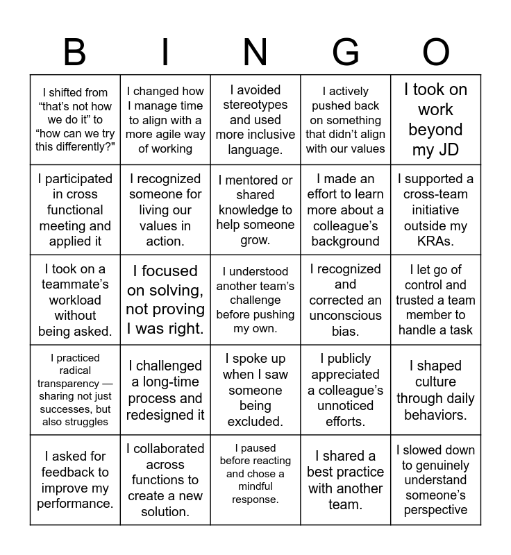 This bingo card has a free space and 24 words: I challenged a long-time process and redesigned it, I collaborated across functions to create a new solution., I mentored or shared knowledge to help someone grow., I asked for feedback to improve my performance., I took on work beyond my JD, I shifted from “that’s not how we do it” to “how can we try this differently?", I participated in cross functional meeting and applied it, I changed how I manage time to align with a more agile way of working, I recognized and corrected an unconscious bias., I spoke up when I saw someone being excluded., I made an effort to learn more about a colleague’s background, I took on a teammate’s workload without being asked., I publicly appreciated a colleague’s unnoticed efforts., I shaped culture through daily behaviors., I recognized someone for living our values in action., I shared a best practice with another team., I let go of control and trusted a team member to handle a task, I avoided stereotypes and used more inclusive language., I supported a cross-team initiative outside my KRAs., I focused on solving, not proving I was right., I slowed down to genuinely understand someone’s perspective, I practiced radical transparency — sharing not just successes, but also struggles, I actively pushed back on something that didn’t align with our values and I paused before reacting and chose a mindful response..