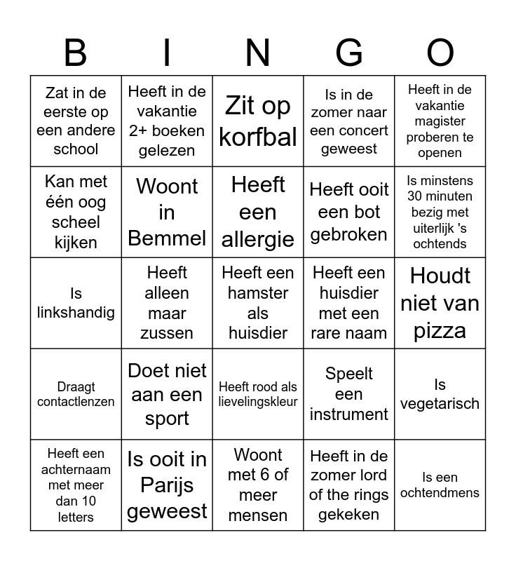 This bingo card has 25 words: Doet niet aan een sport, Woont met 6 of meer mensen, Heeft een allergie, Heeft een achternaam met meer dan 10 letters, Heeft in de vakantie magister proberen te openen, Zat in de eerste op een andere school, Kan met één oog scheel kijken, Heeft in de vakantie 2+ boeken gelezen, Heeft een huisdier met een rare naam, Heeft rood als lievelingskleur, Heeft ooit een bot gebroken, Is linkshandig, Speelt een instrument, Is vegetarisch, Woont in Bemmel, Is een ochtendmens, Houdt niet van pizza, Zit op korfbal, Is minstens 30 minuten bezig met uiterlijk 's ochtends, Heeft alleen maar zussen, Heeft een hamster als huisdier, Is ooit in Parijs geweest, Draagt contactlenzen, Is in de zomer naar een concert geweest and Heeft in de zomer lord of the rings gekeken.