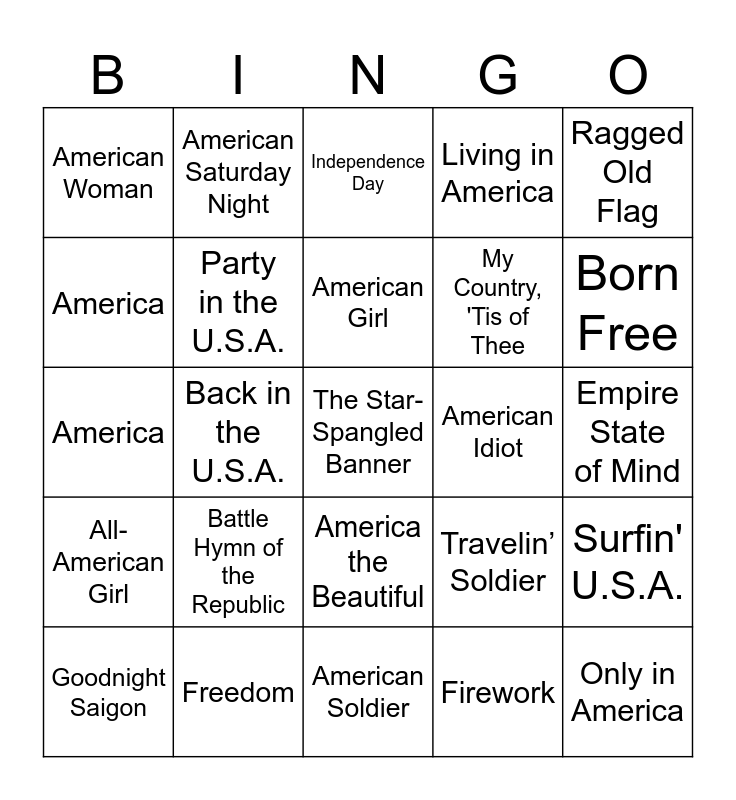 This bingo card has 35 words: Born in the U.S.A., God Bless the U.S.A., Courtesy of the Red, White and Blue, Party in the U.S.A., America the Beautiful, Living in America, America, R.O.C.K. in the U.S.A., American Girl, American Pie, America, Ragged Old Flag, We’re an American Band, Where Were You (When the World Stopped Turning), American Woman, American Idiot, Firework, Back in the U.S.A., All-American Girl, The Star-Spangled Banner, Travelin’ Soldier, Goodnight Saigon, Surfin' U.S.A., Freedom, Independence Day, Born Free, Only in America, This Land Is Your Land, My Country, 'Tis of Thee, Empire State of Mind, Philadelphia Freedom, American Soldier, Battle Hymn of the Republic, American Saturday Night and Pink Houses.