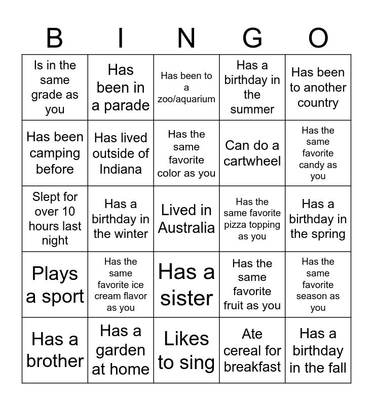 This bingo card has a free space and 39 words: Has a pet cat, Has a pet dog, Has a pet that is not a cat or dog, Has lived outside of Indiana, Has a brother, Has a sister, Has the same favorite color as you, Has the same favorite food as you, Has been to another country, Plays a sport, Has a birthday in the winter, Has a birthday in the summer, Has a birthday in the fall, Has a birthday in the spring, Has the same favorite pizza topping as you, Has the same favorite ice cream flavor as you, Plays an instrument, Is in the same grade as you, Goes to the same school as you, Has the same favorite fruit as you, Has been camping before, Likes to sing, Can do a cartwheel, Has the same favorite candy as you, Is left handed, Wears glasses, Wears contacts, Has danced in a dance recital, Has met someone famous, Has been in a parade, Can solve a rubik's cube, Has a secret handshake with someone, Has been to a zoo/aquarium, Has a garden at home, Ate cereal for breakfast, Has ran a race, Has the same favorite season as you, Slept for over 10 hours last night and Loves thunderstorms.