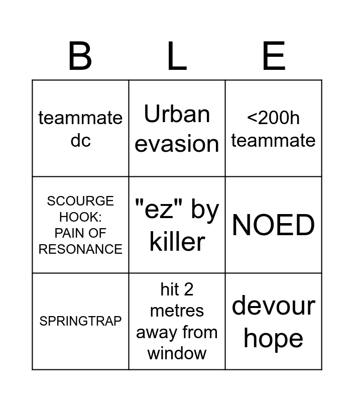 This bingo card has 9 words: SPRINGTRAP, <200h teammate, Urban evasion, SCOURGE HOOK: PAIN OF RESONANCE, teammate dc, NOED, "ez" by killer, devour hope and hit 2 metres away from window.