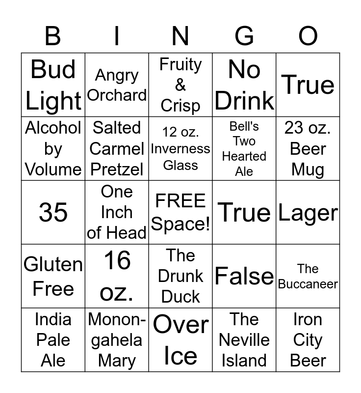 This bingo card has a free space and 24 words: 16 oz., Monon-gahela Mary, 12 oz. Inverness Glass, India Pale Ale, True, Bud Light, Alcohol by Volume, Angry Orchard, True, The Drunk Duck, Bell's Two Hearted Ale, 35, False, The Buccaneer, Salted Carmel Pretzel, The Neville Island, Lager, Fruity & Crisp, 23 oz. Beer Mug, One Inch of Head, Iron City Beer, Gluten Free, No Drink and Over Ice.