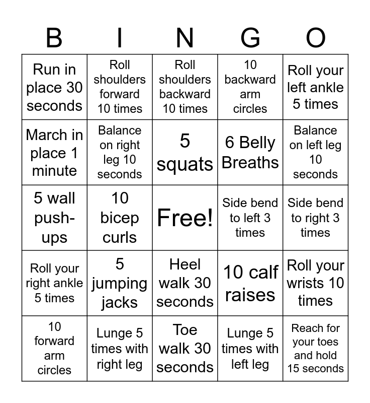 This bingo card has a free space and 24 words: 5 jumping jacks, Lunge 5 times with right leg, 5 squats, 10 forward arm circles, Roll your left ankle 5 times, Run in place 30 seconds, March in place 1 minute, Roll shoulders forward 10 times, Side bend to left 3 times, Heel walk 30 seconds, 6 Belly Breaths, 5 wall push-ups, 10 calf raises, Roll your wrists 10 times, Balance on right leg 10 seconds, Lunge 5 times with left leg, Side bend to right 3 times, Roll shoulders backward 10 times, Balance on left leg 10 seconds, 10 bicep curls, Reach for your toes and hold 15 seconds, Roll your right ankle 5 times, 10 backward arm circles and Toe walk 30 seconds.