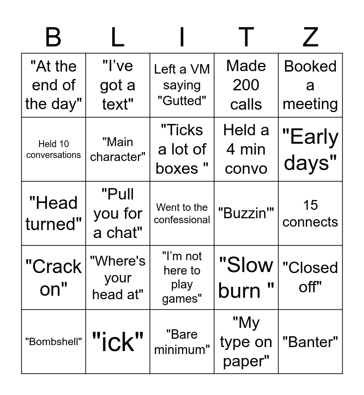 This bingo card has a free space and 24 words: "Where's your head at", "ick", "Ticks a lot of boxes ", "Bombshell", Booked a meeting, "At the end of the day", Held 10 conversations, "I’ve got a text", "Buzzin'", "I’m not here to play games", Held a 4 min convo, "Head turned", "Slow burn ", "Closed off", "Main character", "My type on paper", 15 connects, Left a VM saying "Gutted", "Early days", "Pull you for a chat", "Banter", "Crack on", Made 200 calls and "Bare minimum".