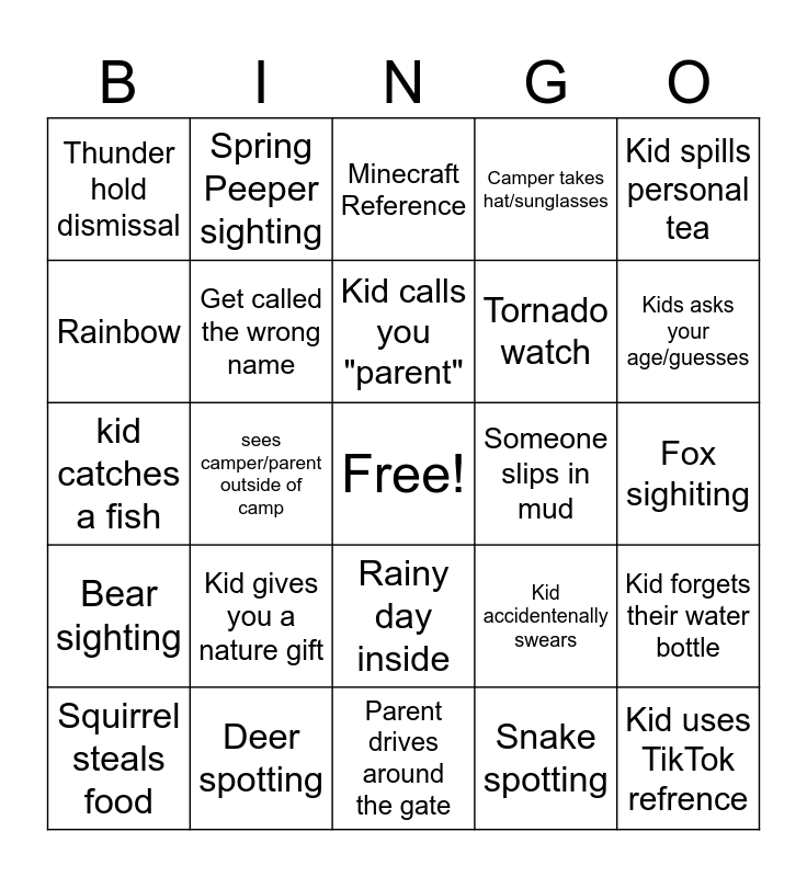 This bingo card has a free space and 24 words: Kid gives you a nature gift, Deer spotting, Kid calls you "parent", Squirrel steals food, Kid spills personal tea, Thunder hold dismissal, Rainbow, Spring Peeper sighting, Someone slips in mud, Rainy day inside, Tornado watch, kid catches a fish, Kid accidentenally swears, Kid forgets their water bottle, Get called the wrong name, Snake spotting, Fox sighiting, Minecraft Reference, Kids asks your age/guesses, sees camper/parent outside of camp, Kid uses TikTok refrence, Bear sighting, Camper takes hat/sunglasses and Parent drives around the gate.