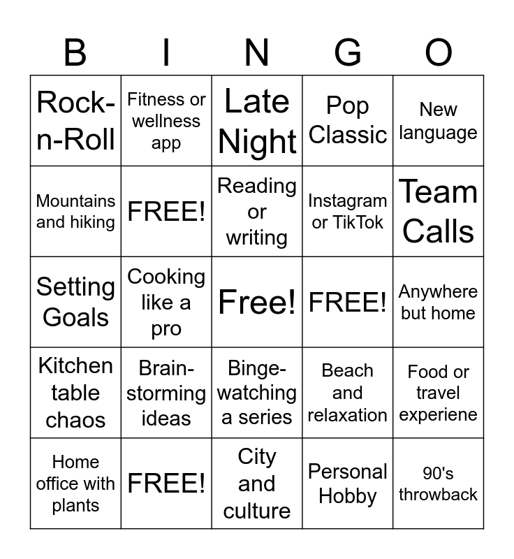 This bingo card has a free space and 39 words: To-do list, Calendar blocking, Based on urgency, FREE!, Home office with plants, Binge-watching a series, Reading or writing, Public speaking, New language, Kitchen table chaos, Cooking like a pro, Pop Classic, 90's throwback, Anywhere but home, FREE!, Brain-storming ideas, Seeing the timeline, Rock-n-Roll, Slack message, Beach and relaxation, Mountains and hiking, City and culture, Instagram or TikTok, Team Calls, Hitting Targets, Learning new things, Team recognition, Spotify or music streaming, Emails, Fitness or wellness app, Early morning, Afternoon, Late Night, FREE!, Personal Hobby, Life Lesson, Food or travel experiene, Setting Goals and Outdoor adventure.
