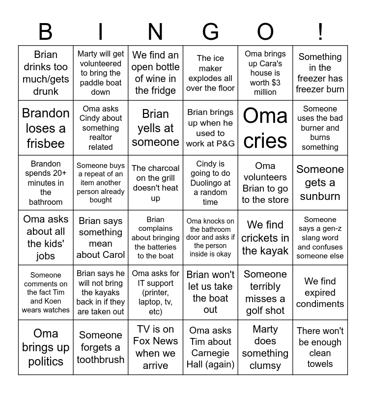 This bingo card has 36 words: Brian won't let us take the boat out, Oma asks for IT support (printer, laptop, tv, etc), Oma asks Tim about Carnegie Hall (again), Brandon loses a frisbee, Oma asks about all the kids' jobs, Cindy is going to do Duolingo at a random time, Oma asks Cindy about something realtor related, TV is on Fox News when we arrive, Oma brings up Cara's house is worth $3 million, Someone terribly misses a golf shot, Someone uses the bad burner and burns something, The ice maker explodes all over the floor, We find expired condiments, Someone buys a repeat of an item another person already bought, Brian brings up when he used to work at P&G, Brian drinks too much/gets drunk, Someone comments on the fact Tim and Koen wears watches, Oma volunteers Brian to go to the store, Brandon spends 20+ minutes in the bathroom, We find an open bottle of wine in the fridge, The charcoal on the grill doesn't heat up, Brian says something mean about Carol, Oma knocks on the bathroom door and asks if the person inside is okay, Brian complains about bringing the batteries to the boat, We find crickets in the kayak, Marty will get volunteered to bring the paddle boat down, Oma cries, Someone forgets a toothbrush, Brian yells at someone, Something in the freezer has freezer burn, There won't be enough clean towels, Oma brings up politics, Someone says a gen-z slang word and confuses someone else, Someone gets a sunburn, Brian says he will not bring the kayaks back in if they are taken out and Marty does something clumsy.