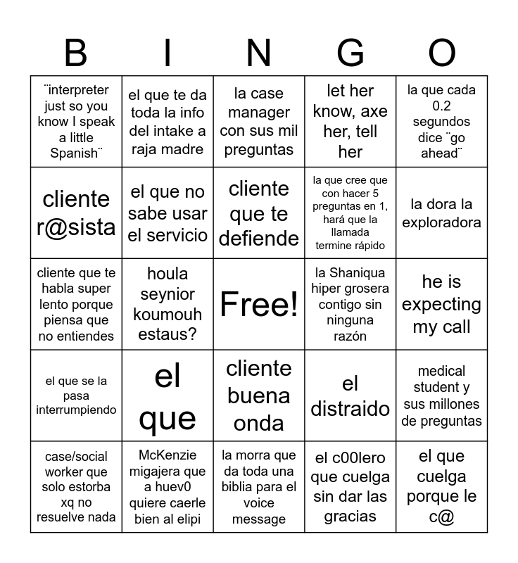 This bingo card has a free space and 24 words: el que, McKenzie migajera que a huev0 quiere caerle bien al elipi, cliente que te defiende, case/social worker que solo estorba xq no resuelve nada, la que cada 0.2 segundos dice ¨go ahead¨, ¨interpreter just so you know I speak a little Spanish¨, cliente r@sista, el que te da toda la info del intake a raja madre, la Shaniqua hiper grosera contigo sin ninguna razón, cliente buena onda, la que cree que con hacer 5 preguntas en 1, hará que la llamada termine rápido, cliente que te habla super lento porque piensa que no entiendes, el distraido, medical student y sus millones de preguntas, el que no sabe usar el servicio, el c00lero que cuelga sin dar las gracias, he is expecting my call, la case manager con sus mil preguntas, la dora la exploradora, houla seynior koumouh estaus?, el que cuelga porque le c@, el que se la pasa interrumpiendo, let her know, axe her, tell her and la morra que da toda una biblia para el voice message.