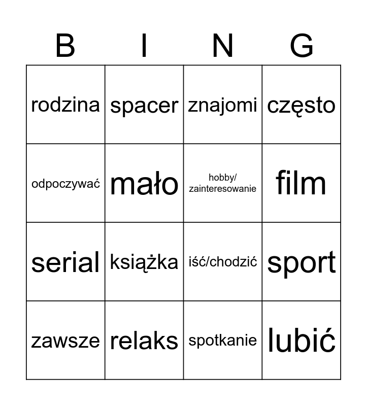 This bingo card has 16 words: relaks, sport, znajomi, rodzina, serial, spacer, iść/chodzić, spotkanie, odpoczywać, mało, zawsze, często, książka, film, hobby/ zainteresowanie and lubić.