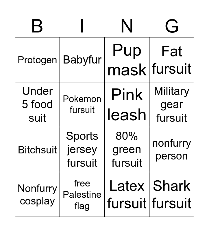 This bingo card has 16 words: free Palestine flag, nonfurry person, Pup mask, Protogen, Bitchsuit, Babyfur, 80% green fursuit, Latex fursuit, Under 5 food suit, Pokemon fursuit, Nonfurry cosplay, Fat fursuit, Sports jersey fursuit, Military gear fursuit, Pink leash and Shark fursuit.