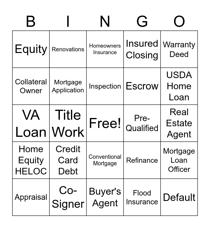 This bingo card has a free space and 36 words: Down Payment, Flood Insurance, Grants, Escrow, Default, Appraisal, Credit Card Debt, Credit Score, Insured Closing, First-Time Homebuyer, Home Equity HELOC, Title Work, FHA, Real Estate Agent, VA Loan, Renovations, Buyer's Agent, Pre-Qualified, USDA Home Loan, Equity, Co-Signer, Inspection, Refinance, Walk Through, Foreclosure, Mortgage Application, Homeowners Insurance, Purchase Agreement, Warranty Deed, Collateral Owner, Property Taxes, Conventional Mortgage, Flood Insurance, Mortgage Loan Officer, Lien and Closing Cost.