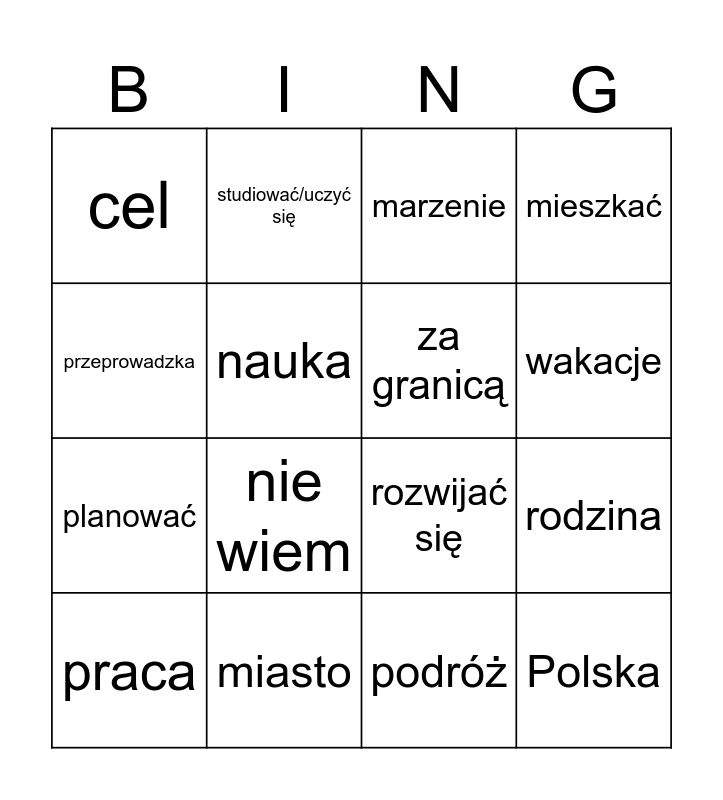 This bingo card has 16 words: miasto, rodzina, marzenie, cel, planować, studiować/uczyć się, rozwijać się, podróż, przeprowadzka, nauka, praca, mieszkać, nie wiem, wakacje, za granicą and Polska.