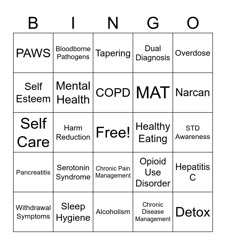This bingo card has a free space and 24 words: Serotonin Syndrome, Sleep Hygiene, COPD, Withdrawal Symptoms, Overdose, PAWS, Self Esteem, Bloodborne Pathogens, Healthy Eating, Chronic Pain Management, MAT, Self Care, Opioid Use Disorder, Hepatitis C, Mental Health, Chronic Disease Management, STD Awareness, Tapering, Narcan, Harm Reduction, Detox, Pancreatitis, Dual Diagnosis and Alcoholism.