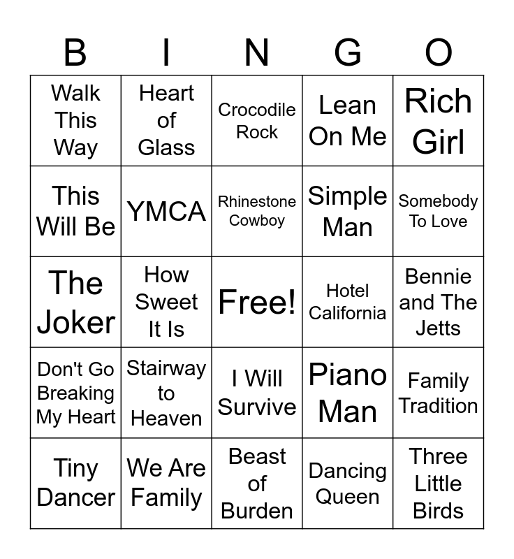 This bingo card has a free space and 29 words: Tiny Dancer, Maggie May, How Sweet It Is, Best of My Love, Walk This Way, Crocodile Rock, YMCA, Stairway to Heaven, Hotel California, We Are Family, Bennie and The Jetts, Three Little Birds, Beast of Burden, Dancing Queen, Somebody To Love, Go Your Own Way, I Will Survive, Don't Go Breaking My Heart, Rich Girl, The Joker, Piano Man, Take Me Home, Simple Man, This Will Be, Lean On Me, Heart of Glass, Family Tradition, Rhinestone Cowboy and Country Roads.