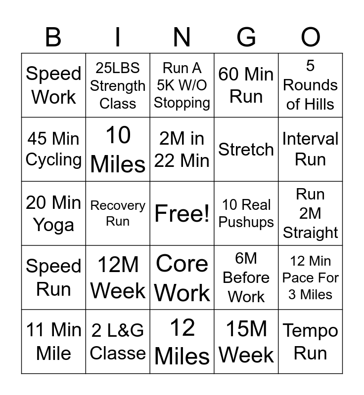 This bingo card has a free space and 24 words: 12M Week, 2 L&G Classe, 2M in 22 Min, 11 Min Mile, 5 Rounds of Hills, Speed Work, 45 Min Cycling, 25LBS Strength Class, 10 Real Pushups, Core Work, Stretch, 20 Min Yoga, 6M Before Work, 12 Min Pace For 3 Miles, 10 Miles, 15M Week, Run 2M Straight, Run A 5K W/O Stopping, Interval Run, Recovery Run, Tempo Run, Speed Run, 60 Min Run and 12 Miles.