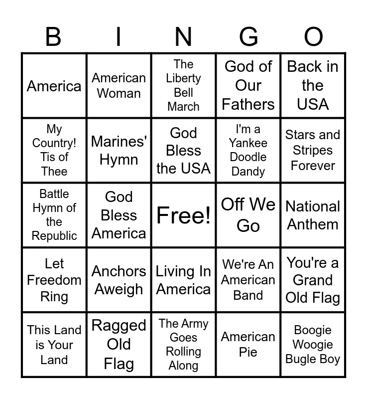 This bingo card has a free space and 26 words: Living In America, American Pie, God Bless the USA, Ragged Old Flag, Back in the USA, America, My Country! Tis of Thee, American Woman, National Anthem, We're An American Band, I'm a Yankee Doodle Dandy, Battle Hymn of the Republic, You're a Grand Old Flag, This Land is Your Land, God Bless America, American Salute, God of Our Fathers, Let Freedom Ring, The Liberty Bell March, Boogie Woogie Bugle Boy, Stars and Stripes Forever, The Army Goes Rolling Along, Off We Go, Anchors Aweigh, Marines' Hymn and Yankee Doodle.