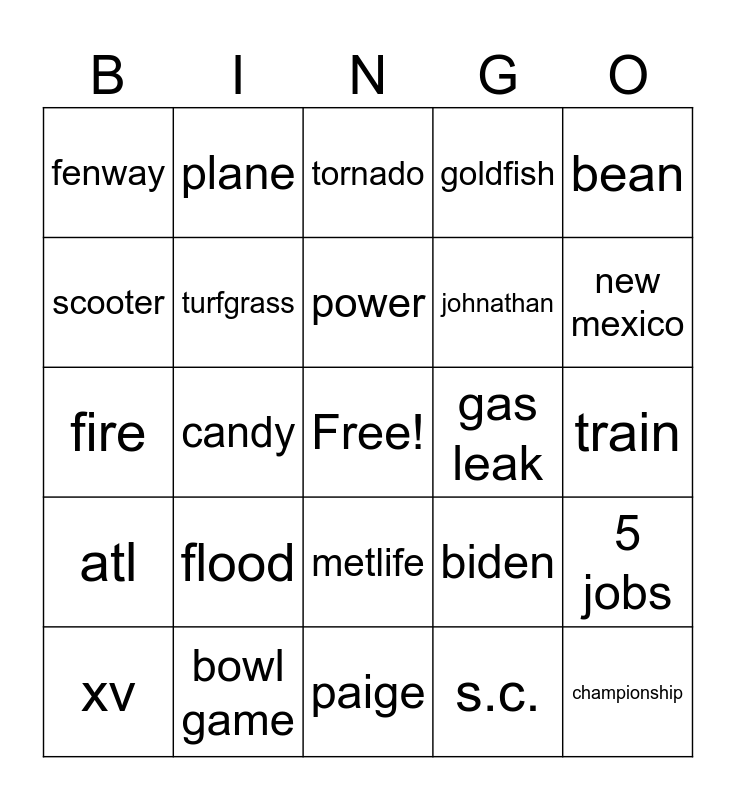 This bingo card has a free space and 24 words: flood, bowl game, power, xv, bean, fenway, scooter, plane, gas leak, metlife, johnathan, fire, biden, 5 jobs, turfgrass, s.c., train, tornado, new mexico, candy, championship, atl, goldfish and paige.