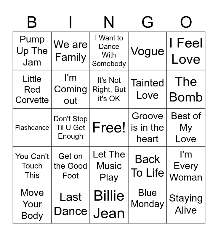 This bingo card has a free space and 29 words: Move Your Body, Into The Groove, Don't Stop Til U Get Enough, I Will Survive, Pump Up The Jam, I Want to Dance With Somebody, I'm Coming out, Get on the Good Foot, Groove is in the heart, Last Dance, Best of My Love, Staying Alive, Billie Jean, Blue Monday, The Bomb, Push It, Let The Music Play, You Can't Touch This, I Feel Love, Flashdance, Back To Life, Get Lucky, Tainted Love, Little Red Corvette, Vogue, We are Family, I'm Every Woman, It's Not Right, But it's OK and Everybody, Everybody.