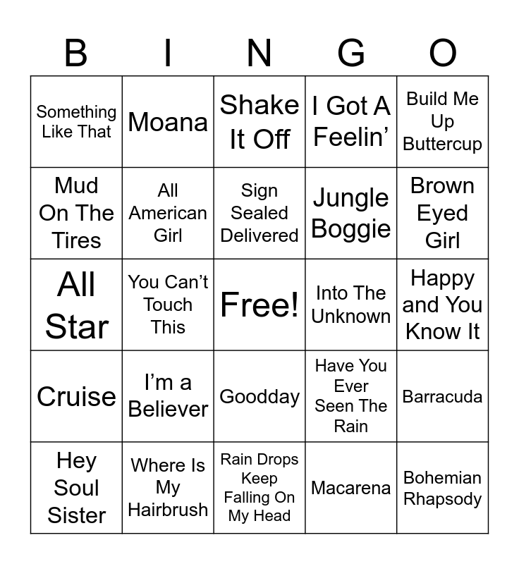This bingo card has a free space and 103 words: Living On A Prayer, YMCA, Build Me Up Buttercup, Hey Jude, Walking On Sunshine, Don’t Stop Believin, Happy, Dancing Queen, Let It Go, Hakuna Matata, We Don’t Talk About Bruno, September, Cupid Shuffle, Sweet Caroline, Life Is A Highway, The Way You Make Me Feel, Shake It Off, Bye Bye Bye, What Makes You Beautiful, Eye Of The Tiger, We Will Rock You, Never Gonna Give You Up, Surfin USA, Baby Shark, Girls just want to have fun, I’m a Believer, Brown Eyed Girl, I Got A Feelin’, Lean On Me, Under Pressure, Have You Ever Seen The Rain, Macarena, Sugar Sugar, MMM Bop, Ain’t No Mountain High Enough, Respect, Best Day Of My Life, Stronger, Sign Sealed Delivered, Where Is My Hairbrush, 9-5, Cruise, Africa, Mud On The Tires, Chicken Fried, Something Like That, Achy Breaky Heart, Bohemian Rhapsody, Basket Case, The Middle, I Want It That Way, Favorite Things, Mamma Mia, Ice Ice Baby, Under Pressure, Hammer Time, Power of Love, We Belong Together, Wheels On The Bus, Goodday, Happy and You Know It, Friends Theme Song, I Like to Move It Move It, Danger Zone, Old McDonald, Uptown girl, Nah Nah Hey Hey Kiss Him Goodbye, Moana, All Star, You Can’t Touch This, Rain Drops Keep Falling On My Head, Here Comes The Sun, Party in the USA, Rocket Man, Cotton Eye Joe, Country Road Take Me Home, Friends In Low Places, Hey Soul Sister, Any Way You Want It, Since You Been Gone, Hit Me With Your Best Shot, Footloose, All American Girl, Crazy, Into The Unknown, Jump Around, Don’t You Worry Bout A Thing, Sweet Home Alabama, Hey Ya, Call Me Maybe, I Want You Back, ABC, Barracuda, I Don’t Want A Lot For Christmas, Thunder Struck, Haven’t Met You Yet, Jungle Boggie, If We Were A Movie, Happy Together, Proud Mary, Despacito, Rolling In The Deep and Burning Love.