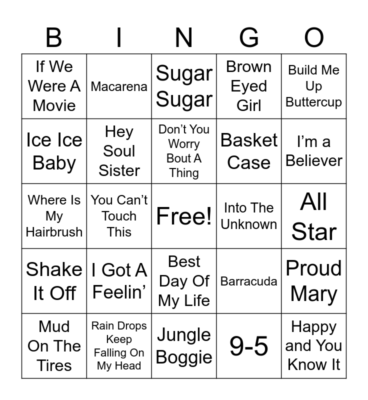 This bingo card has a free space and 102 words: Living On A Prayer, YMCA, Build Me Up Buttercup, Hey Jude, Walking On Sunshine, Don’t Stop Believin, Happy, Dancing Queen, Let It Go, Hakuna Matata, We Don’t Talk About Bruno, September, Cupid Shuffle, Sweet Caroline, Life Is A Highway, The Way You Make Me Feel, Shake It Off, Bye Bye Bye, What Makes You Beautiful, Eye Of The Tiger, We Will Rock You, Never Gonna Give You Up, Surfin USA, Baby Shark, Girls just want to have fun, I’m a Believer, Brown Eyed Girl, I Got A Feelin’, Lean On Me, Have You Ever Seen The Rain, Macarena, Sugar Sugar, MMM Bop, Ain’t No Mountain High Enough, Respect, Best Day Of My Life, Stronger, Sign Sealed Delivered, Where Is My Hairbrush, 9-5, Cruise, Africa, Mud On The Tires, Chicken Fried, Something Like That, Achy Breaky Heart, Bohemian Rhapsody, Basket Case, The Middle, I Want It That Way, Favorite Things, Mamma Mia, Ice Ice Baby, Under Pressure, Hammer Time, Power of Love, We Belong Together, Wheels On The Bus, Goodday, Happy and You Know It, Friends Theme Song, I Like to Move It Move It, Danger Zone, Old McDonald, Uptown girl, Nah Nah Hey Hey Kiss Him Goodbye, Moana, All Star, You Can’t Touch This, Rain Drops Keep Falling On My Head, Here Comes The Sun, Party in the USA, Rocket Man, Cotton Eye Joe, Country Road Take Me Home, Friends In Low Places, Hey Soul Sister, Any Way You Want It, Since You Been Gone, Hit Me With Your Best Shot, Footloose, All American Girl, Crazy, Into The Unknown, Jump Around, Don’t You Worry Bout A Thing, Sweet Home Alabama, Hey Ya, Call Me Maybe, I Want You Back, ABC, Barracuda, I Don’t Want A Lot For Christmas, Thunder Struck, Haven’t Met You Yet, Jungle Boggie, If We Were A Movie, Happy Together, Proud Mary, Despacito, Rolling In The Deep and Burning Love.