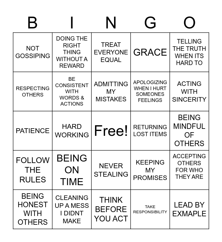 This bingo card has a free space and 24 words: BEING ON TIME, CLEANING UP A MESS I DIDNT MAKE, ADMITTING MY MISTAKES, BEING HONEST WITH OTHERS, TELLING THE TRUTH WHEN ITS HARD TO, NOT GOSSIPING, RESPECTING OTHERS, DOING THE RIGHT THING WITHOUT A REWARD, RETURNING LOST ITEMS, NEVER STEALING, APOLOGIZING WHEN I HURT SOMEONES FEELINGS, PATIENCE, KEEPING MY PROMISES, ACCEPTING OTHERS FOR WHO THEY ARE, BE CONSISTENT WITH WORDS & ACTIONS, TAKE RESPONSIBILITY, BEING MINDFUL OF OTHERS, TREAT EVERYONE EQUAL, ACTING WITH SINCERITY, HARD WORKING, LEAD BY EXMAPLE, FOLLOW THE RULES, GRACE and THINK BEFORE YOU ACT.