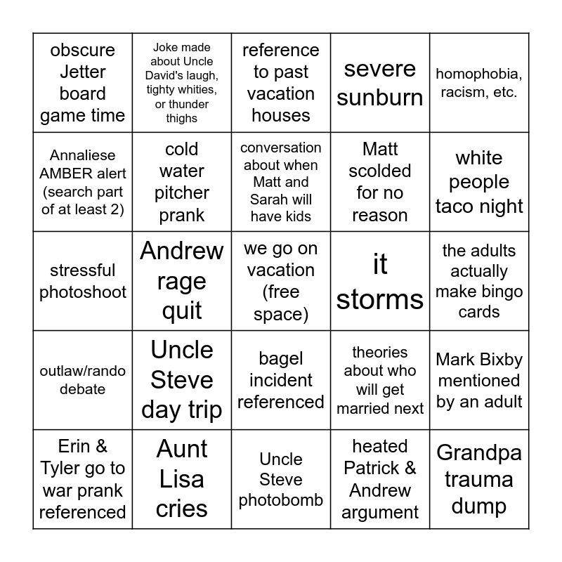 This bingo card has a free space and 34 words: 3 small children cry at the same time, heated Patrick & Andrew argument, Jack makes bourbon slush, you bury someone/are buried in sand, outlaw/rando debate, cold water pitcher prank, homophobia, racism, etc., Erin & Tyler go to war prank referenced, Joke made about Uncle David's laugh, tighty whities, or thunder thighs, Friedrich's Russian ex-girlfriend mentioned, conversation about when Matt and Sarah will have kids, reference to past vacation houses, beach crew shames non-beach crew, angry grocery shopping, it storms, white people taco night, Aunt Lisa cries, stressful photoshoot, Uncle Steve day trip, theories about who will get married next, bagel incident referenced, Uncle David gets someone's name wrong, obscure Jetter board game time, the adults actually make bingo cards, Uncle Steve photobomb, Grandpa trauma dump, severe sunburn, Richie crankiness mentioned, Matt scolded for no reason, Annaliese AMBER alert (search part of at least 2), Andrew verbal eclipse, Andrew rage quit, Mark Bixby mentioned by an adult and Aunt Christie is sad vacation is almost over before Wednesday.