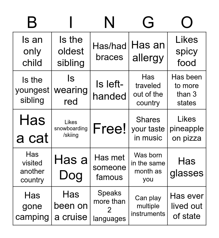 This bingo card has a free space and 24 words: Has a Dog, Has been on a cruise, Is left-handed, Has gone camping, Likes spicy food, Is an only child, Is the youngest sibling, Is the oldest sibling, Shares your taste in music, Has met someone famous, Has traveled out of the country, Has a cat, Was born in the same month as you, Has glasses, Is wearing red, Can play multiple instruments, Likes pineapple on pizza, Has/had braces, Has been to more than 3 states, Likes snowboarding /skiing, Has ever lived out of state, Has visited another country, Has an allergy and Speaks more than 2 languages.