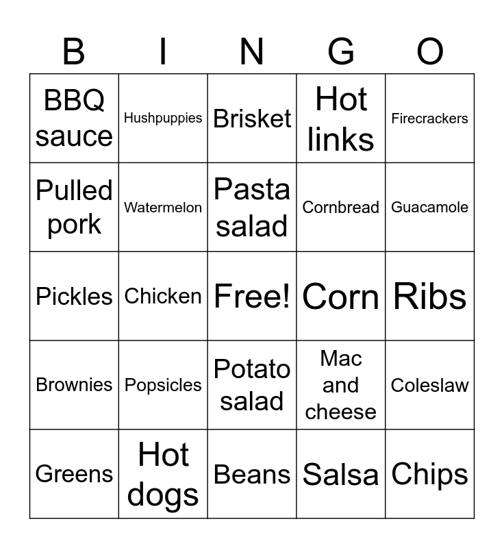 This bingo card has a free space and 30 words: Hot dogs, Burgers, Chicken, Grill, BBQ sauce, Brisket, Watermelon, Potato salad, Corn, Beans, Ribs, Chips, Salsa, Onion dip, Guacamole, Queso dip, Mac and cheese, Brownies, Popsicles, Firecrackers, Pickles, Wings, Hushpuppies, Cornbread, Pulled pork, Hot links, Coleslaw, Greens, Pasta salad and Ice cream.