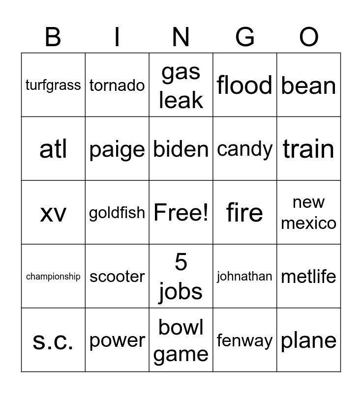 This bingo card has a free space and 24 words: scooter, power, biden, s.c., bean, turfgrass, atl, tornado, fire, 5 jobs, candy, xv, johnathan, metlife, paige, fenway, new mexico, gas leak, train, goldfish, plane, championship, flood and bowl game.