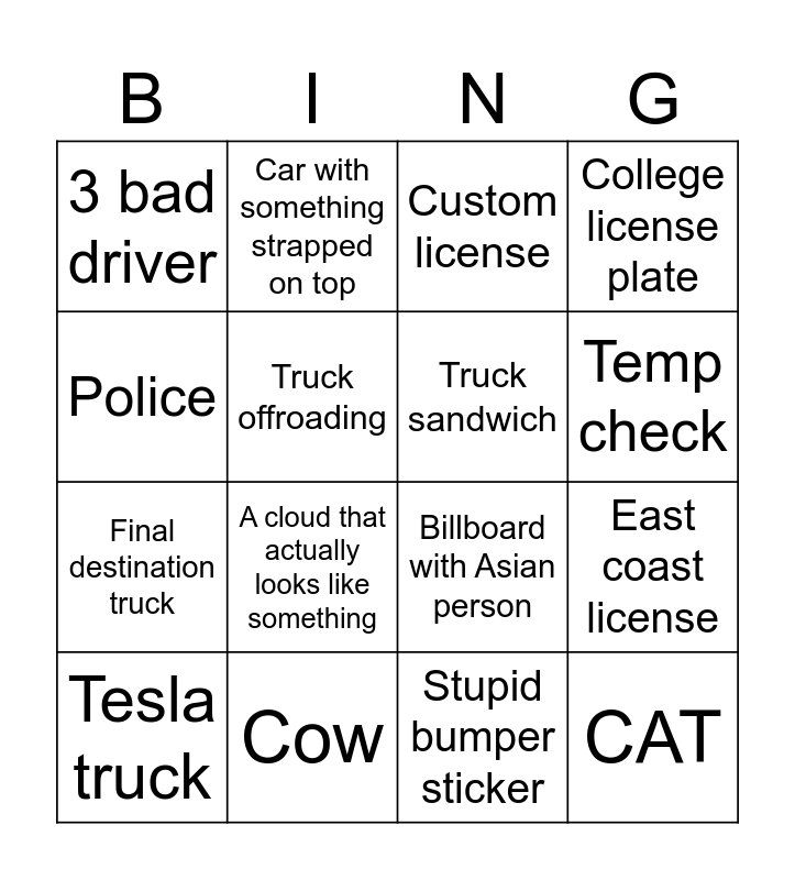 This bingo card has 16 words: Cow, East coast license, Custom license, 3 bad driver, Final destination truck, Car with something strapped on top, Billboard with Asian person, Stupid bumper sticker, Police, Truck offroading, Tesla truck, College license plate, A cloud that actually looks like something, Temp check, Truck sandwich and CAT.