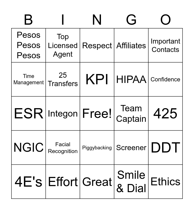 This bingo card has a free space and 25 words: Facial Recognition, Great, KPI, 4E's, Important Contacts, Pesos Pesos Pesos, Time Management, Top Licensed Agent, Team Captain, Piggybacking, HIPAA, ESR, Screener, DDT, 25 Transfers, Applause, 425, Respect, Confidence, Integon, Ethics, Effort, NGIC, Affiliates and Smile & Dial.