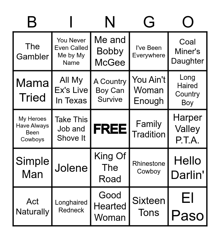 This bingo card has a free space and 47 words: Ring of Fire, El Paso, Mammas Don't Let Your Babies Grow up to Be Cowboys, Good Hearted Woman, Jolene, Always On My Mind, You Never Even Called Me by My Name, Luckenbach Texas, Mama Tried, Blue Eyes Crying In the Rain, All My Ex's Live In Texas, I've Been Everywhere, Hello Darlin', Rhinestone Cowboy, Thank God I'm a Country Boy, East Bound and Down, A Country Boy Can Survive, Family Tradition, Whiskey River, Coal Miner's Daughter, Take This Job and Shove It, Sixteen Tons, The Gambler, You Ain't Woman Enough, Lucille, Long Haired Country Boy, Act Naturally, I'm So Lonesome I Could Cry, King Of The Road, Simple Man, Big River, Angel from Montgomery, Honky Tonk Man, Ocean Front Property, Okie From Muskogee, Longhaired Redneck, Harper Valley P.T.A., Folsom Prison Blues, The Devil Went Down to Georgia, The Party's Over, Jackson, Me and Bobby McGee, My Heroes Have Always Been Cowboys, You're The Reason Our Kids Are Ugly, Stranger In The House, Silver Wings and Back In the Saddle Again.