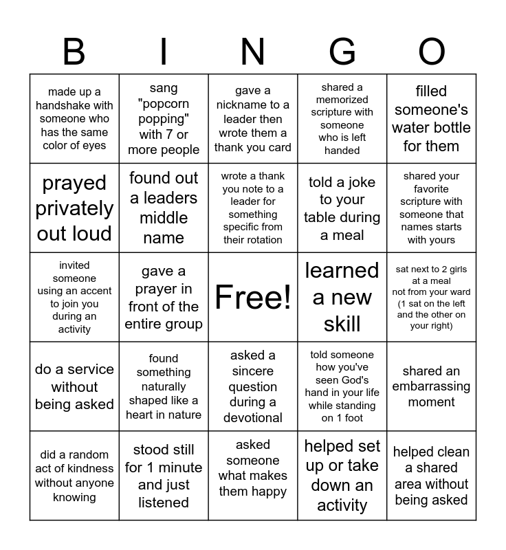 This bingo card has a free space and 29 words: did a random act of kindness without anyone knowing, gave someone a sincere compliment, gave a prayer in front of the entire group, spent 5 minute alone reading scriptures, made up a handshake with someone who has the same color of eyes, gave a nickname to a leader then wrote them a thank you card, found out a leaders middle name, found something naturally shaped like a heart in nature, learned a new skill, stood still for 1 minute and just listened, sat next to 2 girls at a meal not from your ward (1 sat on the left and the other on your right), helped clean a shared area without being asked, asked someone what makes them happy, helped set up or take down an activity, shared your favorite scripture with someone that names starts with yours, wrote a spiritual goal in your journal, asked a sincere question during a devotional, do a service without being asked, filled someone's water bottle for them, invited someone using an accent to join you during an activity, told someone how you've seen God's hand in your life while standing on 1 foot, learn 3 new names and something about each person, told a joke to your table during a meal, prayed privately out loud, shared a memorized scripture with someone who is left handed, sang "popcorn popping" with 7 or more people, shared an embarrassing moment, wrote a thank you note to a leader for something specific from their rotation and found someone with a hidden talent.