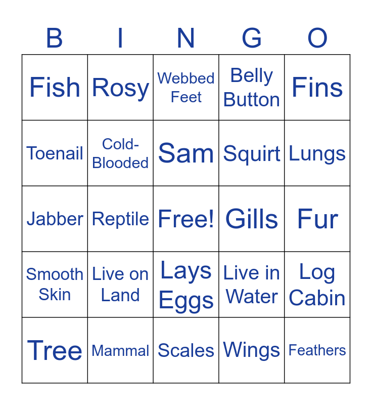This bingo card has a free space and 30 words: Mammal, Bird, Reptile, Amphibian, Fish, Webbed Feet, Cold-Blooded, Lays Eggs, Gills, Scales, Fur, Feathers, Wings, Warm-Blooded, Lungs, Dry Skin, Live in Water, Smooth Skin, Live on Land, Fins, Jabber, Gonzo, Rosy, Squirt, Toenail, Belly Button, Log Cabin, Tree, Sam and Kaukauna.
