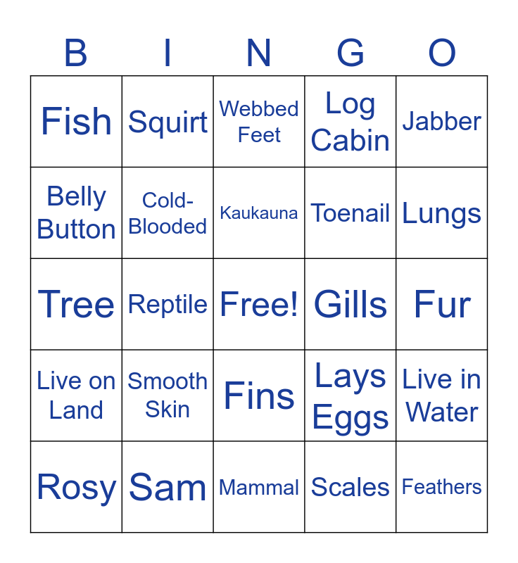 This bingo card has a free space and 31 words: Mammal, Bird, Reptile, Amphibian, Fish, Webbed Feet, Cold-Blooded, Lays Eggs, Gills, Scales, Fur, Feathers, Wings, Warm-Blooded, Lungs, Dry Skin, Live in Water, Smooth Skin, Live on Land, Fins, Jabber, Gonzo, Rosy, Squirt, Toenail, Belly Button, Log Cabin, Tree, Sam, Kaukauna and jabber.