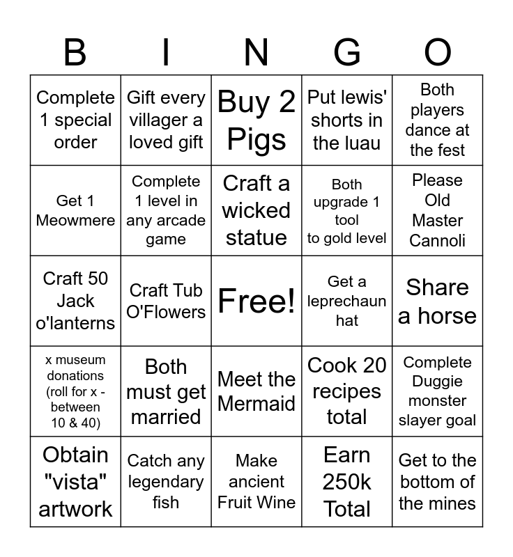 This bingo card has a free space and 24 words: Both must get married, Catch any legendary fish, Craft a wicked statue, Obtain "vista" artwork, Both players dance at the fest, Complete 1 special order, Get 1 Meowmere, Gift every villager a loved gift, Get a leprechaun hat, Meet the Mermaid, Both upgrade 1 tool to gold level, Craft 50 Jack o'lanterns, Cook 20 recipes total, Complete Duggie monster slayer goal, Complete 1 level in any arcade game, Earn 250k Total, Share a horse, Buy 2 Pigs, Please Old Master Cannoli, Craft Tub O'Flowers, Get to the bottom of the mines, x museum donations (roll for x - between 10 & 40), Put lewis' shorts in the luau and Make ancient Fruit Wine.