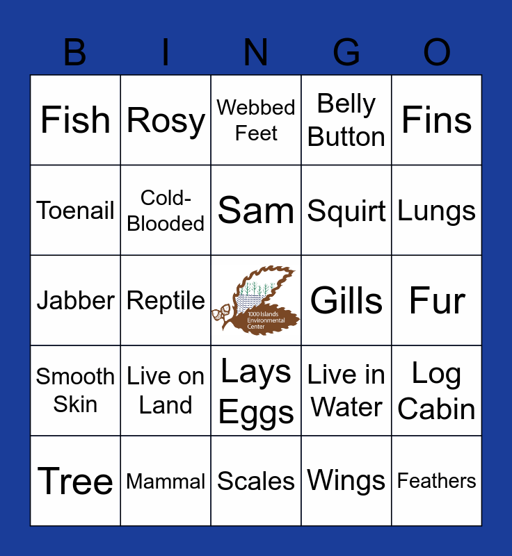 This bingo card has a free space and 30 words: Mammal, Bird, Reptile, Amphibian, Fish, Webbed Feet, Cold-Blooded, Lays Eggs, Gills, Scales, Fur, Feathers, Wings, Warm-Blooded, Lungs, Dry Skin, Live in Water, Smooth Skin, Live on Land, Fins, Jabber, Gonzo, Rosy, Squirt, Toenail, Belly Button, Log Cabin, Tree, Sam and Kaukauna.