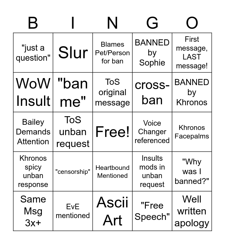 This bingo card has a free space and 52 words: Trying to dodge Automod, Well written apology, "I was joking", Ascii Art, "censorship", Discusses Politics, Slur, Discusses Religion, WoW Insult, Accidental Ban, "ban me", "shill", "Why was I banned?", Insults mods in unban request, "ego", Big Chat History, ToS original message, Voice Changer referenced, Excessive Spam, First message, LAST message!, ToS unban request, "Free Speech", "just a question", cross-ban, Offensive Username, Ban Evasion, BANNED by Matt, BANNED by NotIrma, BANNED by Khronos, BANNED by Ham, BANNED by Thor, BANNED by Sophie, BANNED by Maggie, BANNED by MagicalStarr, "Furry" mentioned, Blames Pet/Person for ban, EvE mentioned, Insults Chat (Cult, Parasocial, Toxic, etc), BANNED by Heimdall, BANNED by Wulf, Advertising/ Self Advertising, Khronos Facepalms, Khronos spicy unban response, Original ban msg insults the mods, Heartbound Mentioned, Coding Reference, Khronos Smug Face, Bailey Demands Attention, "Don't Unban Me", Khronos Screenshot, Same Msg 3x+ and Mods Aren't Paid.