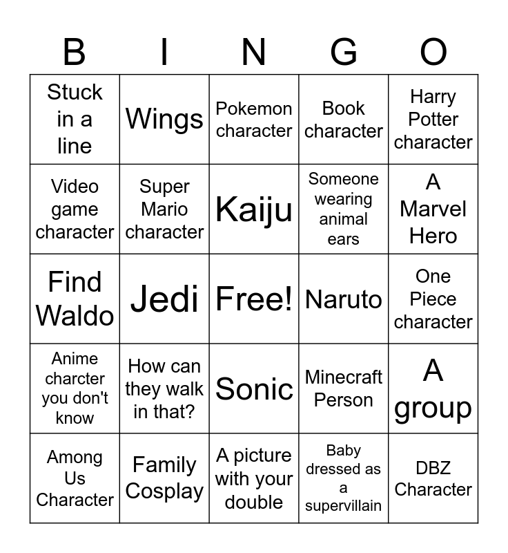 This bingo card has a free space and 30 words: Family Cosplay, Storm Trooper, Jedi, Giant Weapon, Stuck in a line, Pokemon character, Super Mario character, Sonic, Naruto, A picture with your double, One Piece character, DBZ Character, Baby dressed as a supervillain, Fake Battle, A Marvel Hero, A DC Hero, Minecraft Person, Anime charcter you don't know, How can they walk in that?, Harry Potter character, Find Waldo, Disney character, Wings, Someone wearing animal ears, Video game character, Book character, A group, Among Us Character, Kaiju and Anime hair.