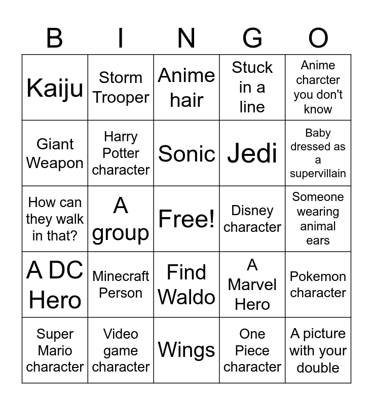 This bingo card has a free space and 30 words: Video game character, Book character, A group, Among Us Character, Kaiju, Anime hair, Harry Potter character, Find Waldo, Disney character, Wings, Someone wearing animal ears, A picture with your double, One Piece character, DBZ Character, Baby dressed as a supervillain, Fake Battle, A Marvel Hero, A DC Hero, Minecraft Person, Anime charcter you don't know, How can they walk in that?, Family Cosplay, Storm Trooper, Jedi, Giant Weapon, Stuck in a line, Pokemon character, Super Mario character, Sonic and Naruto.