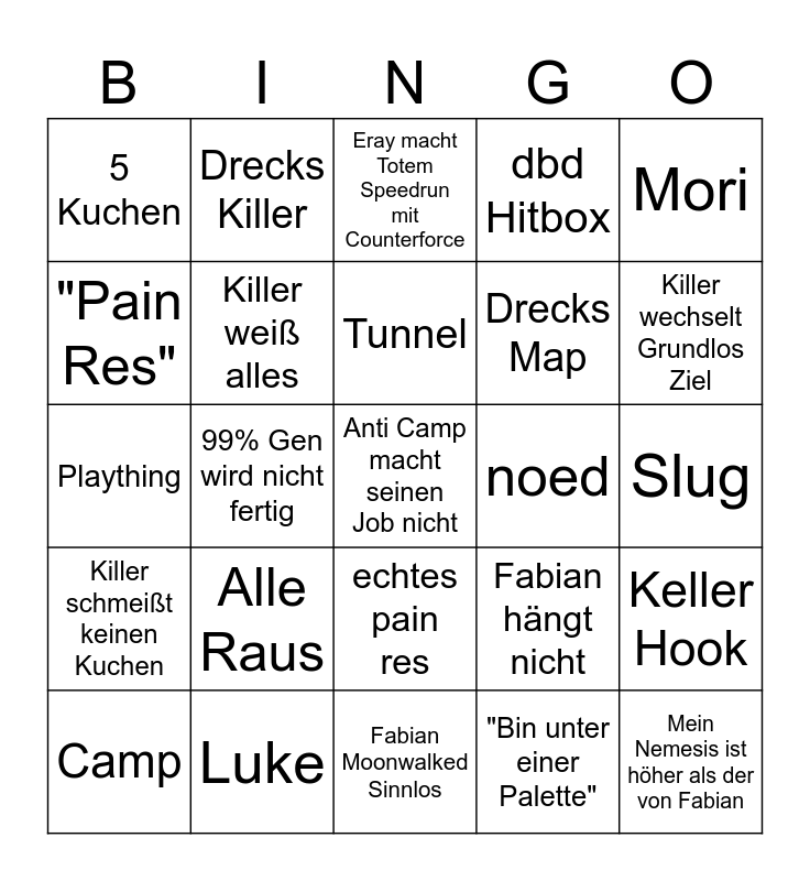 This bingo card has a free space and 24 words: Alle Raus, Luke, Tunnel, Camp, Mori, 5 Kuchen, "Pain Res", Drecks Killer, noed, echtes pain res, Drecks Map, Plaything, Fabian hängt nicht, Keller Hook, Killer weiß alles, "Bin unter einer Palette", Slug, Eray macht Totem Speedrun mit Counterforce, Killer wechselt Grundlos Ziel, 99% Gen wird nicht fertig, Mein Nemesis ist höher als der von Fabian, Killer schmeißt keinen Kuchen, dbd Hitbox and Fabian Moonwalked Sinnlos.