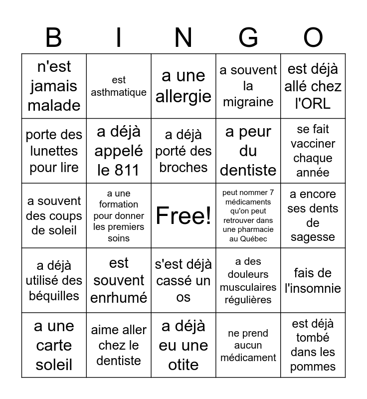 This bingo card has a free space and 24 words: est souvent enrhumé, aime aller chez le dentiste, a déjà porté des broches, a une carte soleil, est déjà allé chez l'ORL, n'est jamais malade, porte des lunettes pour lire, est asthmatique, peut nommer 7 médicaments qu'on peut retrouver dans une pharmacie au Québec, s'est déjà cassé un os, a peur du dentiste, a souvent des coups de soleil, a des douleurs musculaires régulières, fais de l'insomnie, a déjà appelé le 811, ne prend aucun médicament, a encore ses dents de sagesse, a une allergie, se fait vacciner chaque année, a une formation pour donner les premiers soins, est déjà tombé dans les pommes, a déjà utilisé des béquilles, a souvent la migraine and a déjà eu une otite.