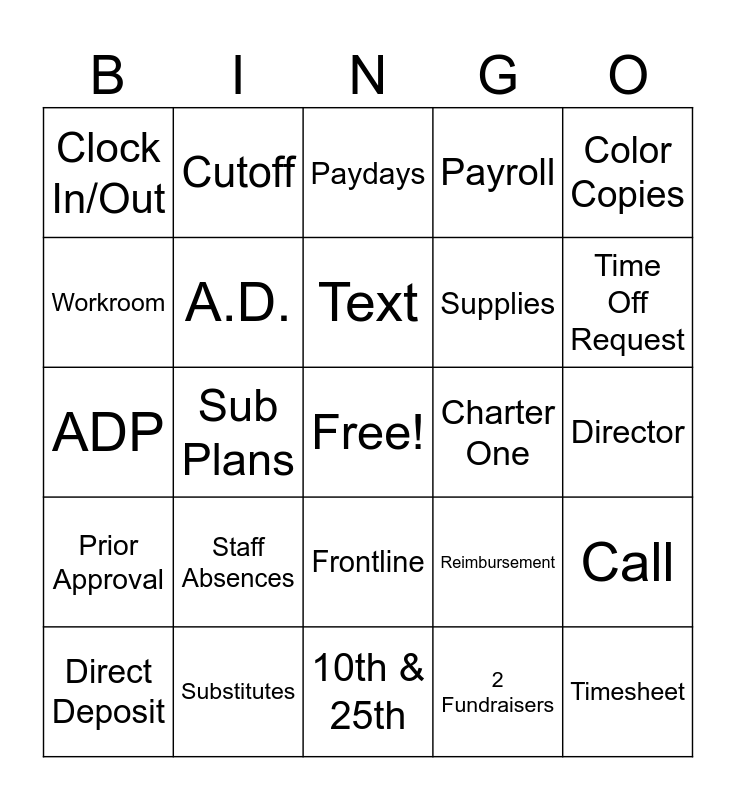 This bingo card has a free space and 29 words: Direct Deposit, Office Manager, Sub Plans, Benefits, Clock In/Out, Paydays, A.D., Staff Absences, Charter One, Substitutes, Director, Timesheet, 10th & 25th, 2 Fundraisers, Time Off Request, Visitors, Frontline, Prior Approval, Color Copies, ADP, Reimbursement, HSA, Supplies, Workroom, Payroll, Cutoff, Call, Text and Email.