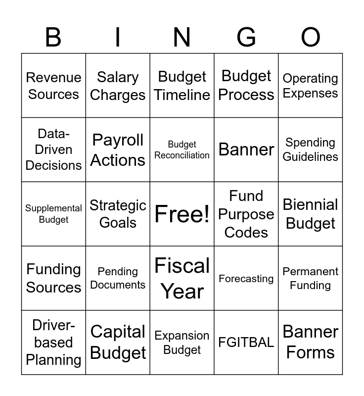 This bingo card has a free space and 90 words: Budget, Budgeting, Fiscal Year, Revenues, Expenditures, Appropriation, Receipts, Capital Improvement, Operating Budget, Strategic Budgeting, Financial Planning, Budget Control, Budget Compliance, Biennial Budget, Budget Allocation, Budget Reconciliation, Budget Revisions, Budget Surplus, Budget Reduction, Budget Availability, General Fund, All Funds Budget, Expansion Budget, Continuation Budget, Supplemental Budget, Capital Budget, Tuition and Fees, Enrollment Growth Funding, Campus-Initiated Tuition Increases (CITI), State Appropriations, Non-recurring Funding, Permanent Funding, One-Time Funding, Funding Sources, Revenue Sources, Budget Process, Budget Timeline, Budget Development, Strategic Goals, Spending Guidelines, Driver-based Planning, Data-Driven Decisions, Cross-Functional Discussions, Budget Justification, Budget Instructions, Forecasting, Budget Book, Position Control, Incremental Budget Template, NC A&T, UNC-System, Banner, SBAC (Strategic Budget Allocation Process), Aggiemart, FOAPAL, Organizational Hierarchy, Fund Purpose Codes, Program Codes, Departmental Budgets, Academic Affairs, Part-Time Instructors (PTIs), Work-Against Funds, Institutional Support, Community Service, FGIBAVL, FGIBDST, FGITRND, FGITBAL, FGITBSR, FRIGITID, Pending Documents, Banner Forms, Budget Rollup Account, Budget Summary, Salary Charges, Payroll Actions, Benefits, Travel Planning, Telephone Charges, Print Charges, Encumbrance, Operating Expenses, General Ledger, Account Codes, Budget Office, Training Sessions, Customer Satisfaction Survey, Budget Office Newsletter, Budget Office Website and Budget Analysts.