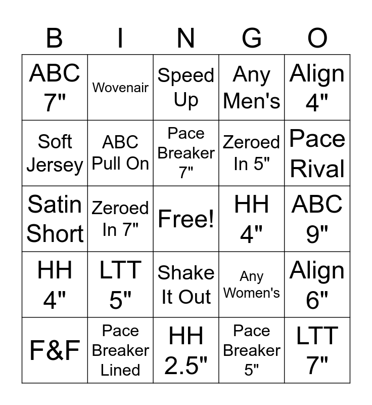 This bingo card has a free space and 24 words: LTT 5", Pace Breaker Lined, Pace Breaker 7", F&F, Align 4", ABC 7", Soft Jersey, Wovenair, HH 4", Shake It Out, Zeroed In 5", Satin Short, Any Women's, Align 6", ABC Pull On, Pace Breaker 5", ABC 9", Speed Up, Pace Rival, Zeroed In 7", LTT 7", HH 4", Any Men's and HH 2.5".